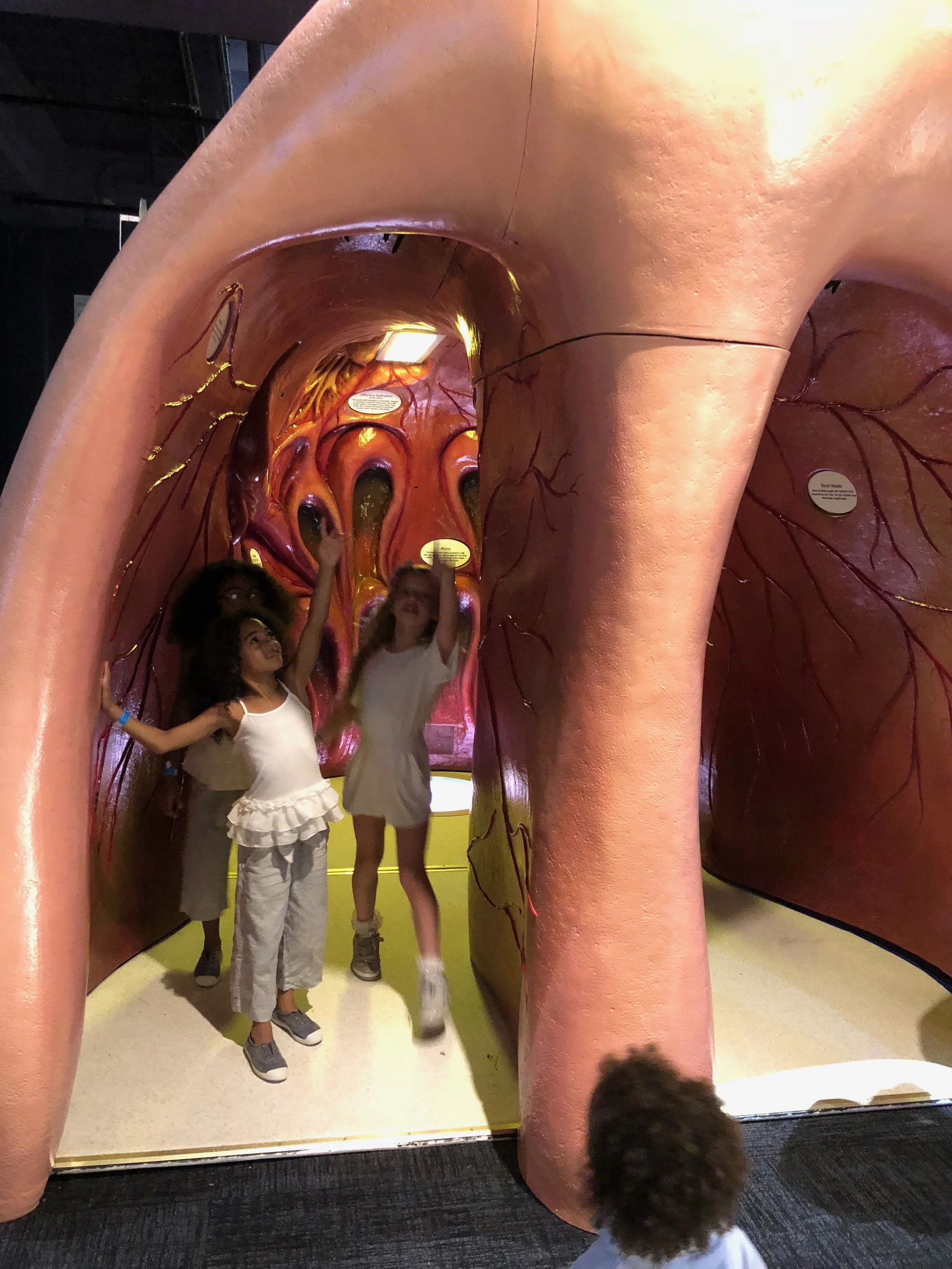 Now onto the Grossology Exhibit where you'll unearth the science behind all things gross about the human body! What kid doesn't think burps are funny! Brent loved sliding down the stomach and I found Brinkley and her friends sniffing all the bad body odors! So fun and icky! But the kids loved every second of it leaning so much along the way. My favorite was the giant game of Operation that let you put larger than life sized internal organs and bones into the correct areas. The kids would have been happy to stay there all day!